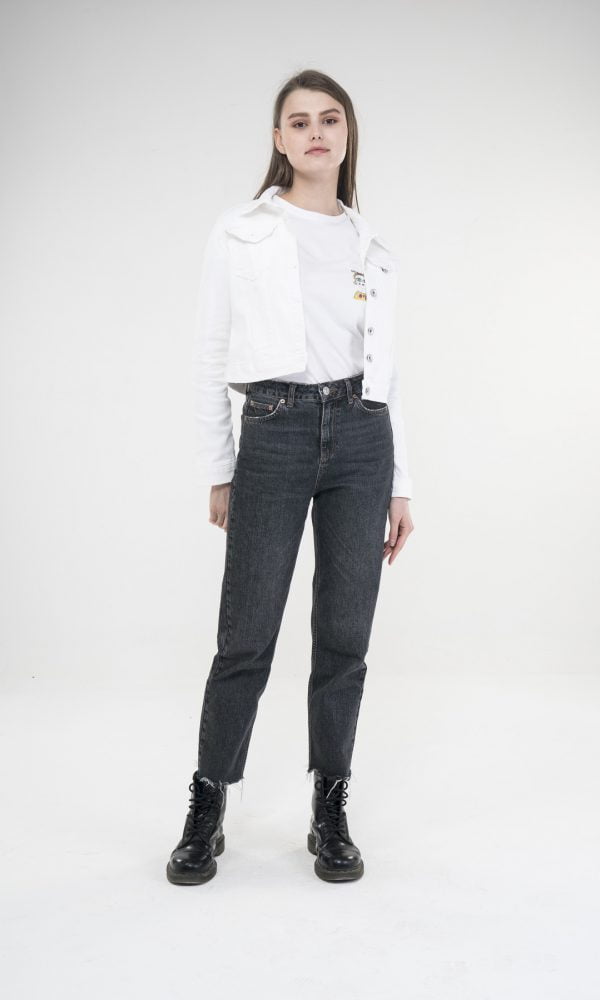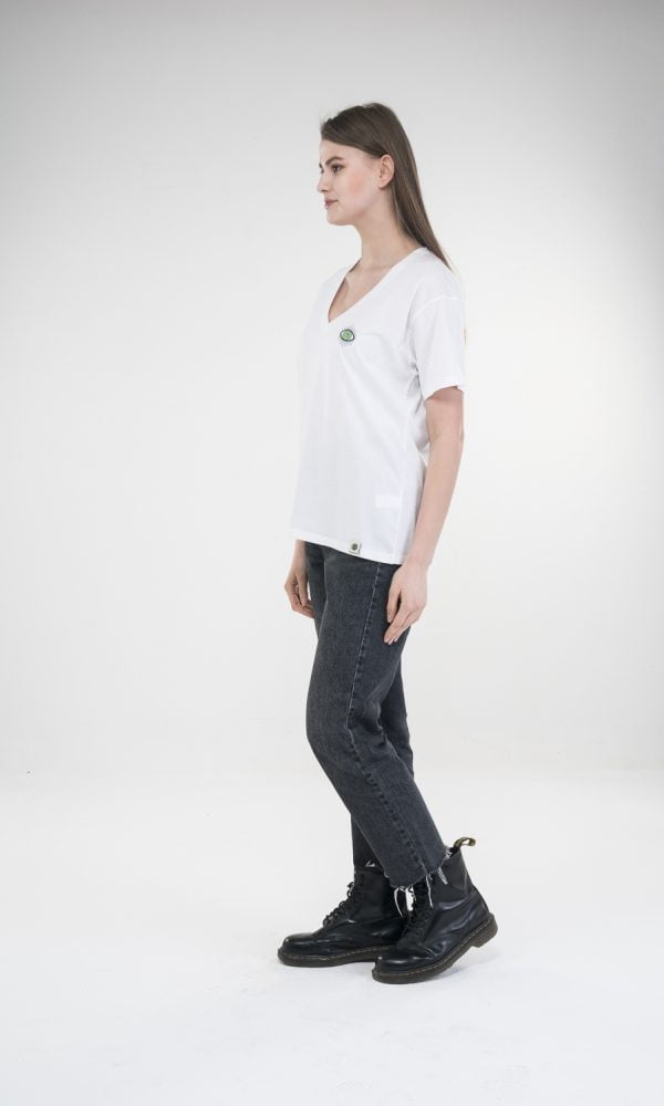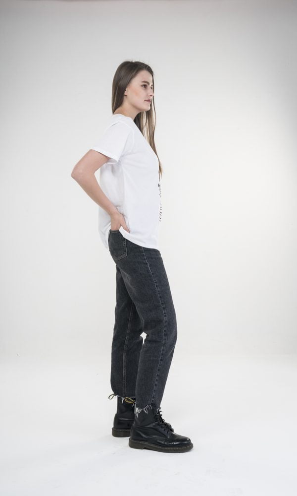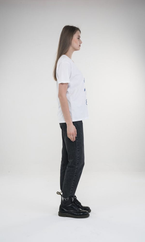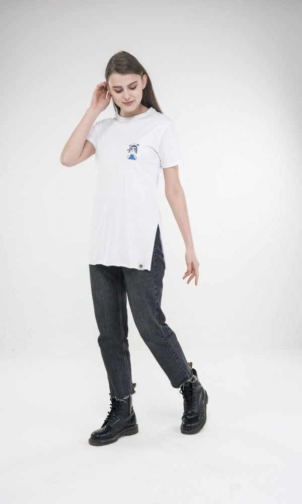 % 100 Cotton Ön kenarda desen baskı Mavi bulutlara hayran başında kelebekler uçuşan kadın desen baskı Arkada minik melek desen baskı Model 175cm S beden giymektedir.
