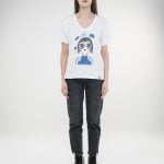 V yaka Kısa kollu Ön baskılı Saçlarına çiçek takıp sanat seven romantik kadın Ensede küçük melek baskı % 100 Cotton Model 175 cm ve S beden giymektedir.