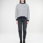 Uzun kollu Kırmızı bandanası ile tatil hayal eden çizgili tshirtü ile özgür kadın desen Arka baskılı Göğüste küçük melek baskı % 100 Cotton Model 175 cm ve S beden giymektedir.